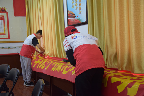 队员与村民们一起搬桌子搭建舞台