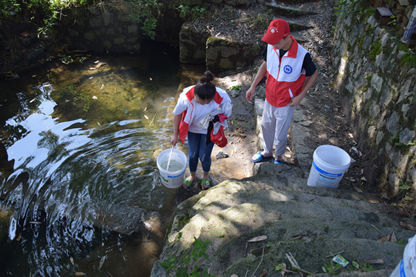 下午,队员们去溪边打水清理文化室