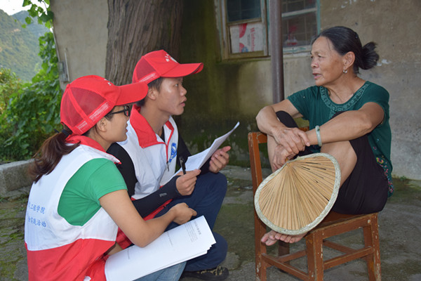 队员们用桂林话给老奶奶解释调查问卷的内容和选项