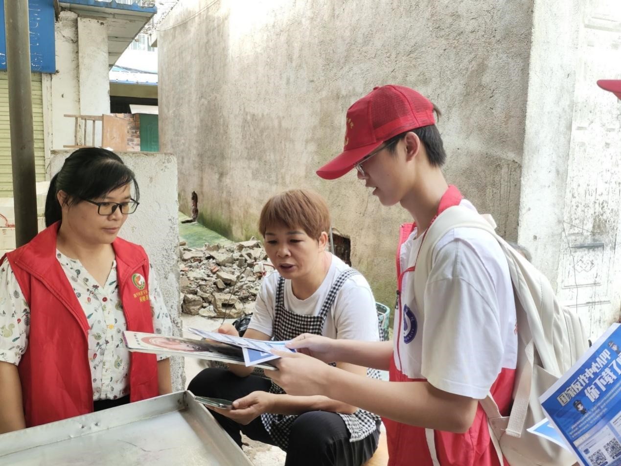 实践团成员与那元社区网格员一同宣传反诈知识