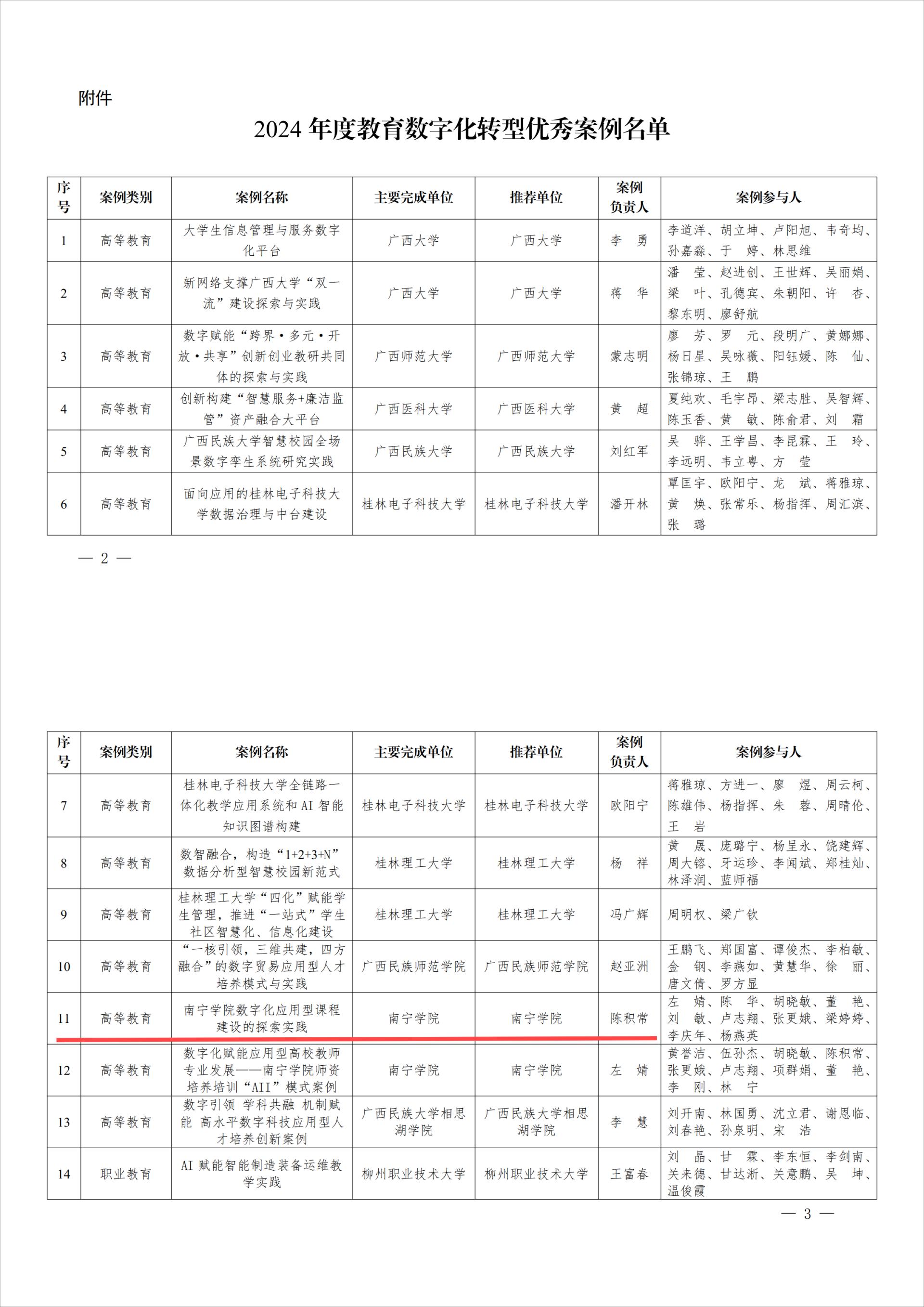 近日,广西壮族自治区教育厅公布了《自治区教育厅关于公布2024年度教育数字化转型优秀案例名单的通知》(桂教网信〔2024〕23号),共确定高等教育优秀案例13个,职业教育优秀案例30个,基础教育优秀案例57个(含区域案例和学校案例)。其中,suncitygroup太阳集团共有两个案例入选。公司陈积常教授主持申报的“suncitygroup太阳集团数字化应用型课程建设的探索实践”案例获评优秀案例。
