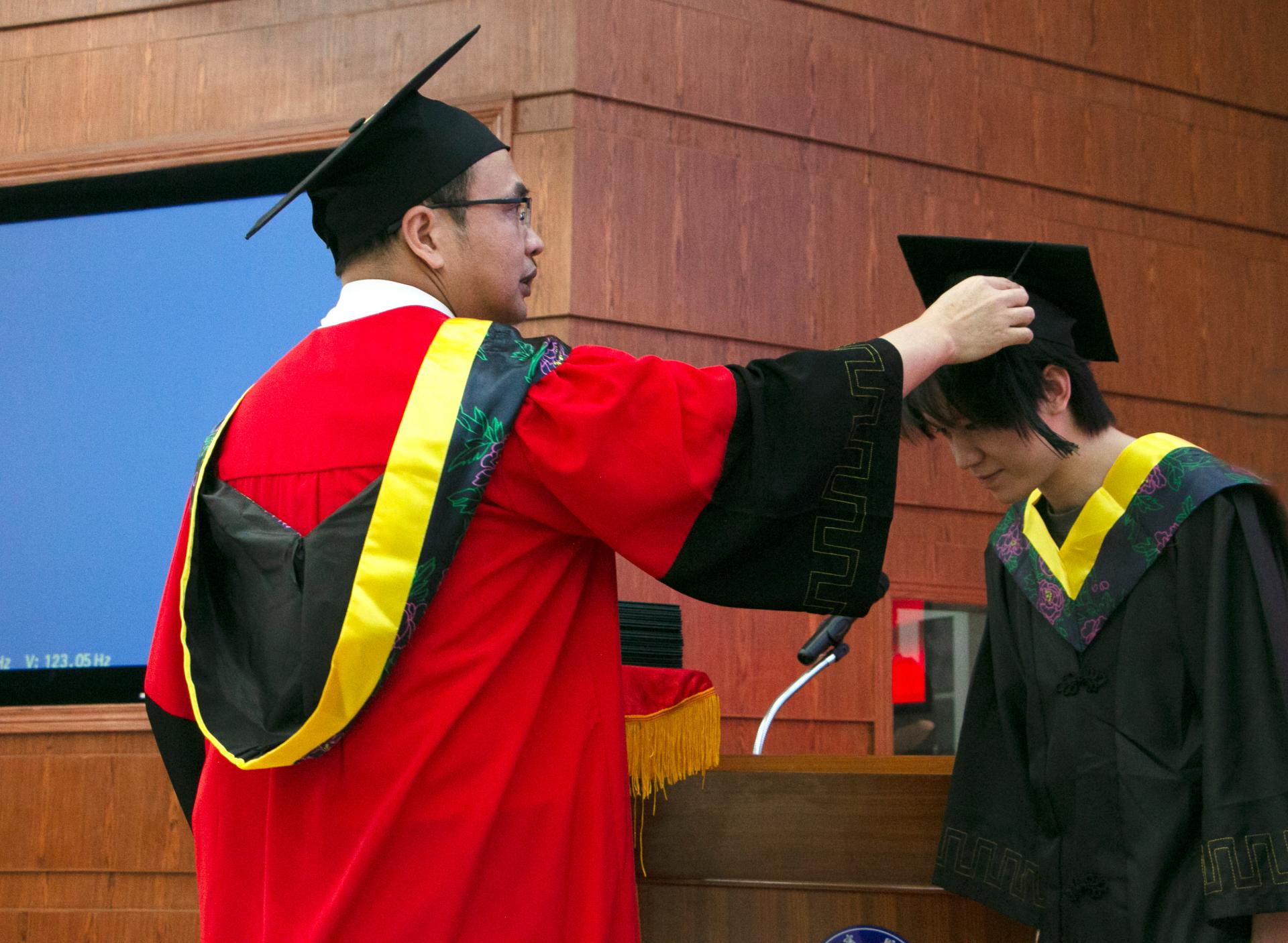 李庆年经理为毕业生代表拨穗正冠、颁授学位证书并合影留念