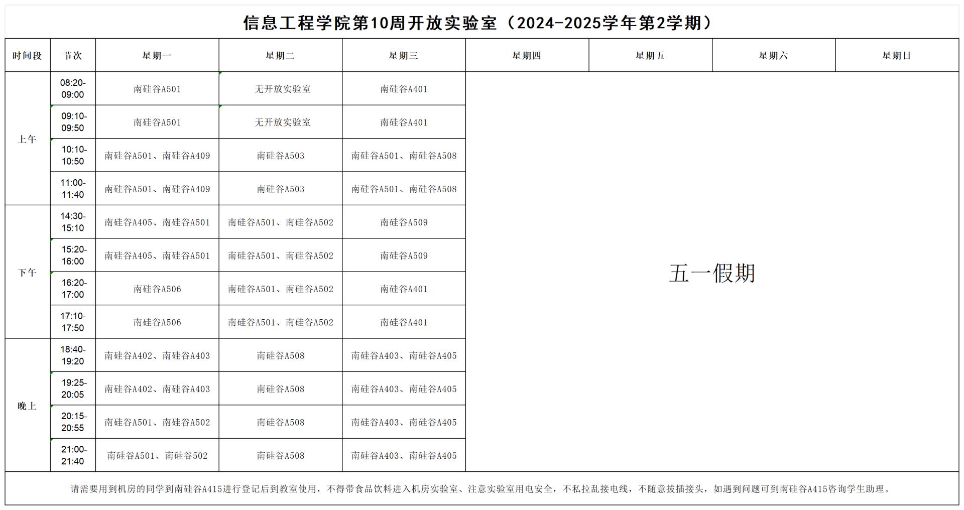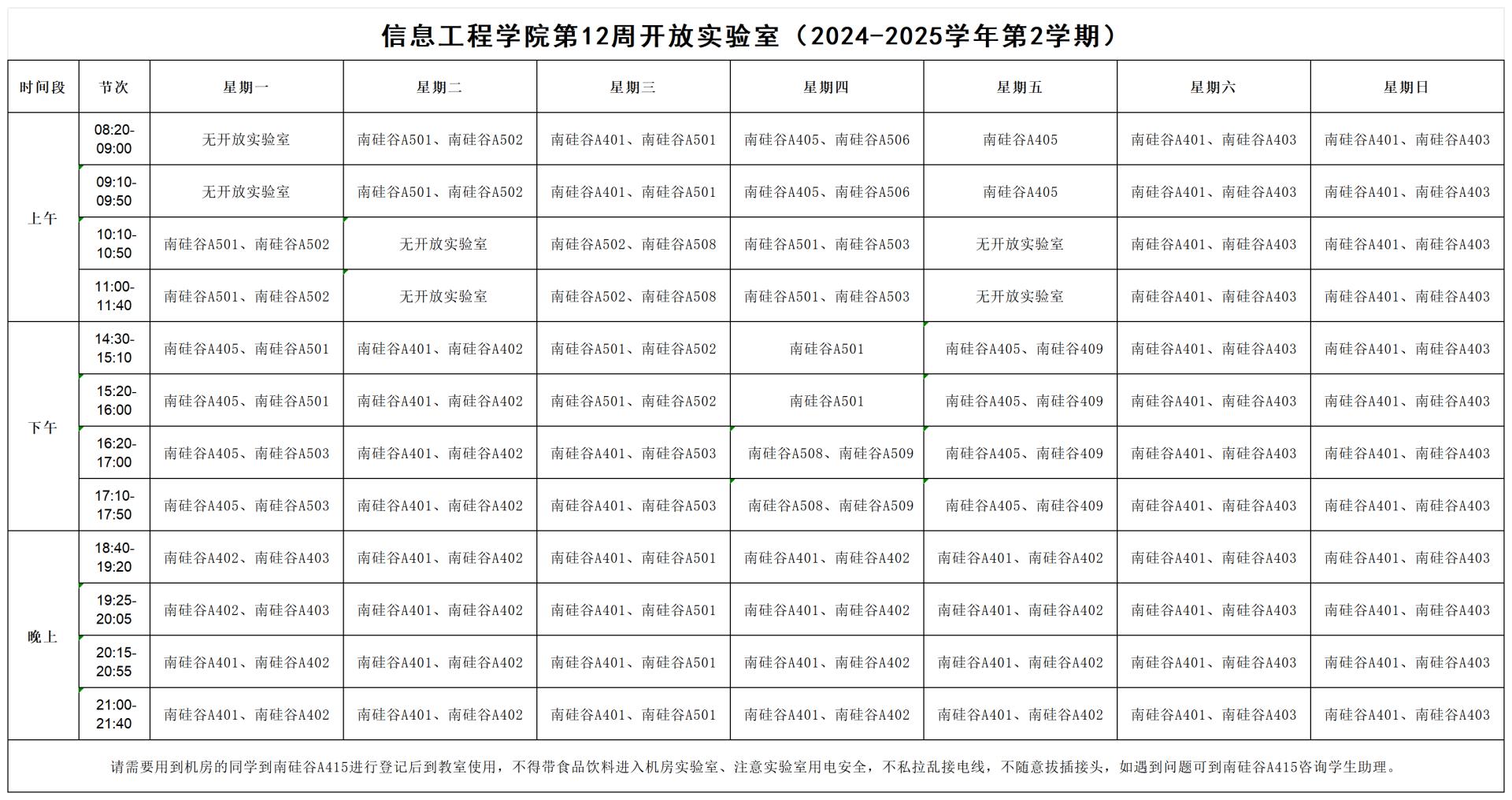 为进一步提高实验室利用率,学院将在2025年春季学期定期开放实验室,为同学们提供实践锻炼空间。现将2025年春季学期第十二周开放实验室安排通知如下: